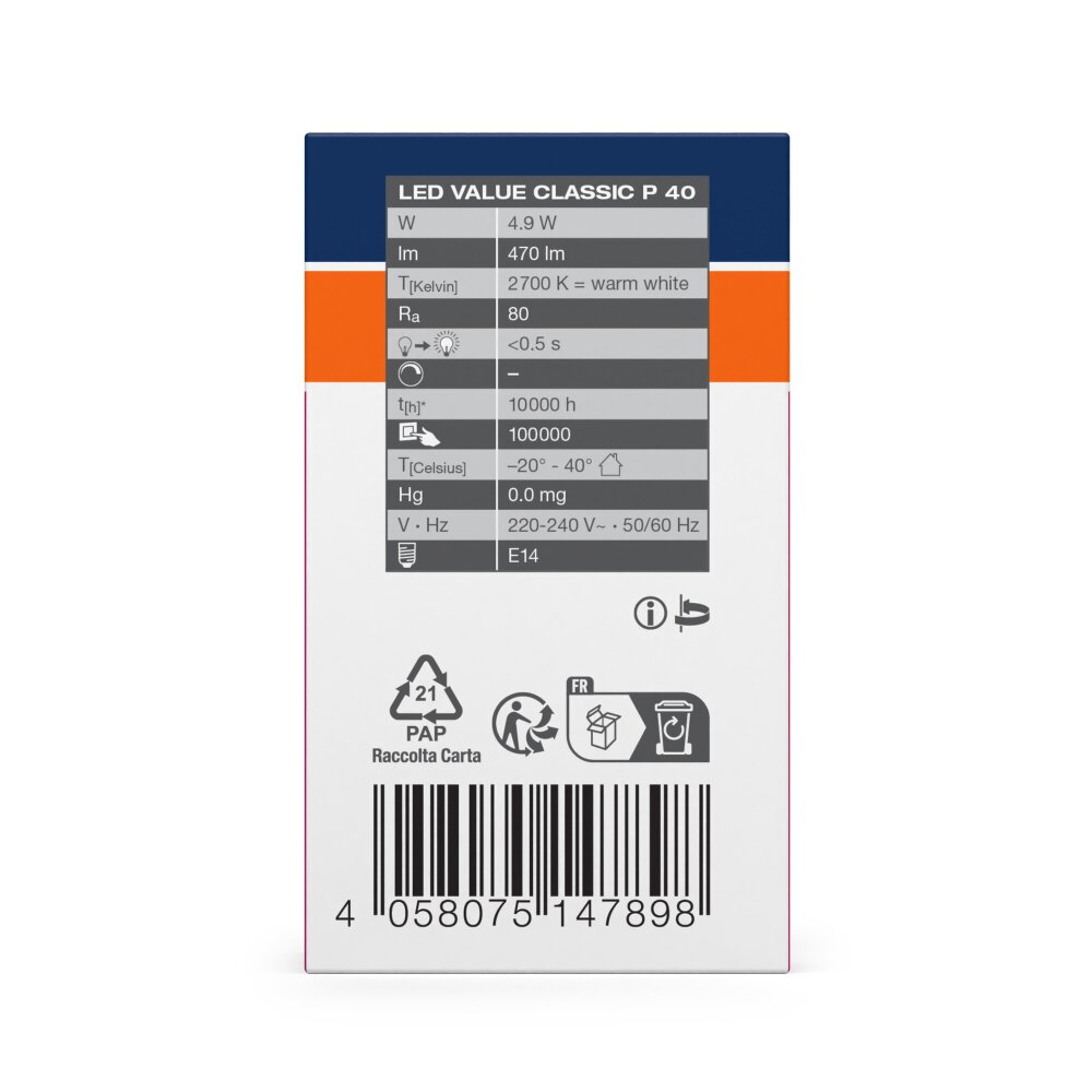 Vergelijkende waarde met gloeilampen:40 Watt